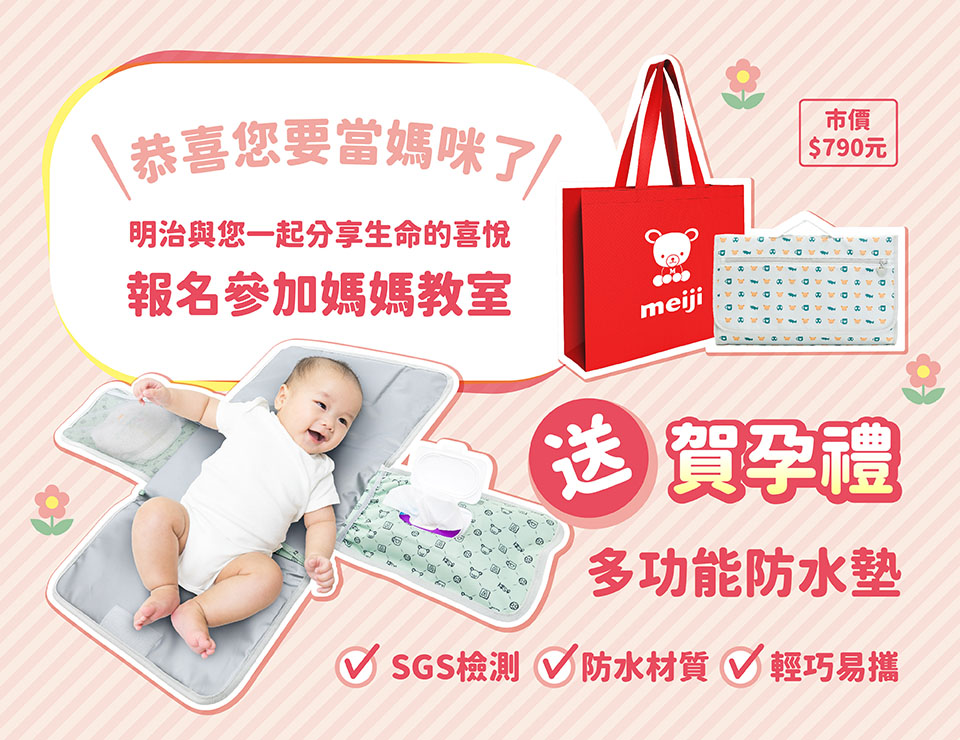 - 符合報名產前/產後媽媽教室資格者,憑衛福部核發的孕婦健康手冊/兒童健康手冊蓋明治戳章,且全程參與可獲得產前賀孕禮/產後育兒禮及參加好禮抽活動。