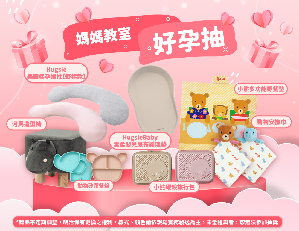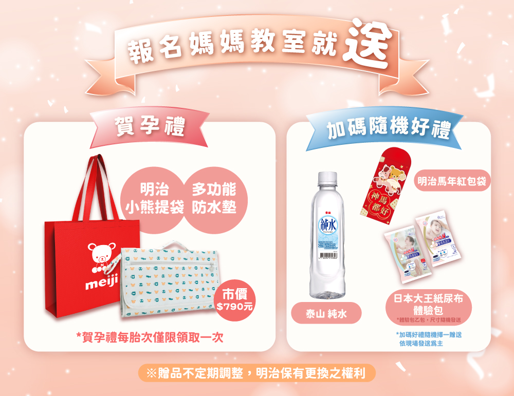 - 符合報名產前/產後媽媽教室資格者,憑衛福部核發的孕婦健康手冊/兒童健康手冊蓋明治戳章,且全程參與可獲得產前賀孕禮/產後育兒禮及參加好禮抽活動。